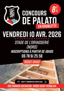 CONCOURS DE PALATO – SPÉCIALE NOCTURNE ! Samedi 26 avril Stade de l’Orvasserie (terrain d’Honneur), Saint-Herblain Inscriptions à partir de 18h00 Début du concours : 19h Bar et restauration sur